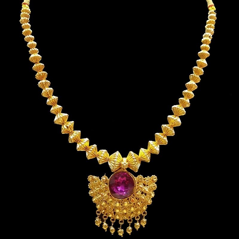 Javmala made up javmani increasing in sizes perodically and a spcial hand made taas pendal. A pendal with a big ruby stone in between and hand crafted pieces along its side in a curve. It also has ghungroos for a traditional look.Due to its thick look it completely fills your neck making it the best jewellery in traditional design. A bit long this javmala should be matched with our range of kolhapuri Saaj. Check it out .
