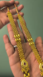 A royal 3 layer maharashtrian long haar design with spot mani beads and hand set pendant. The gold bormala beads give it an unique look. The red crystals gives this kolhapuri jewellery a perfect regal touch.